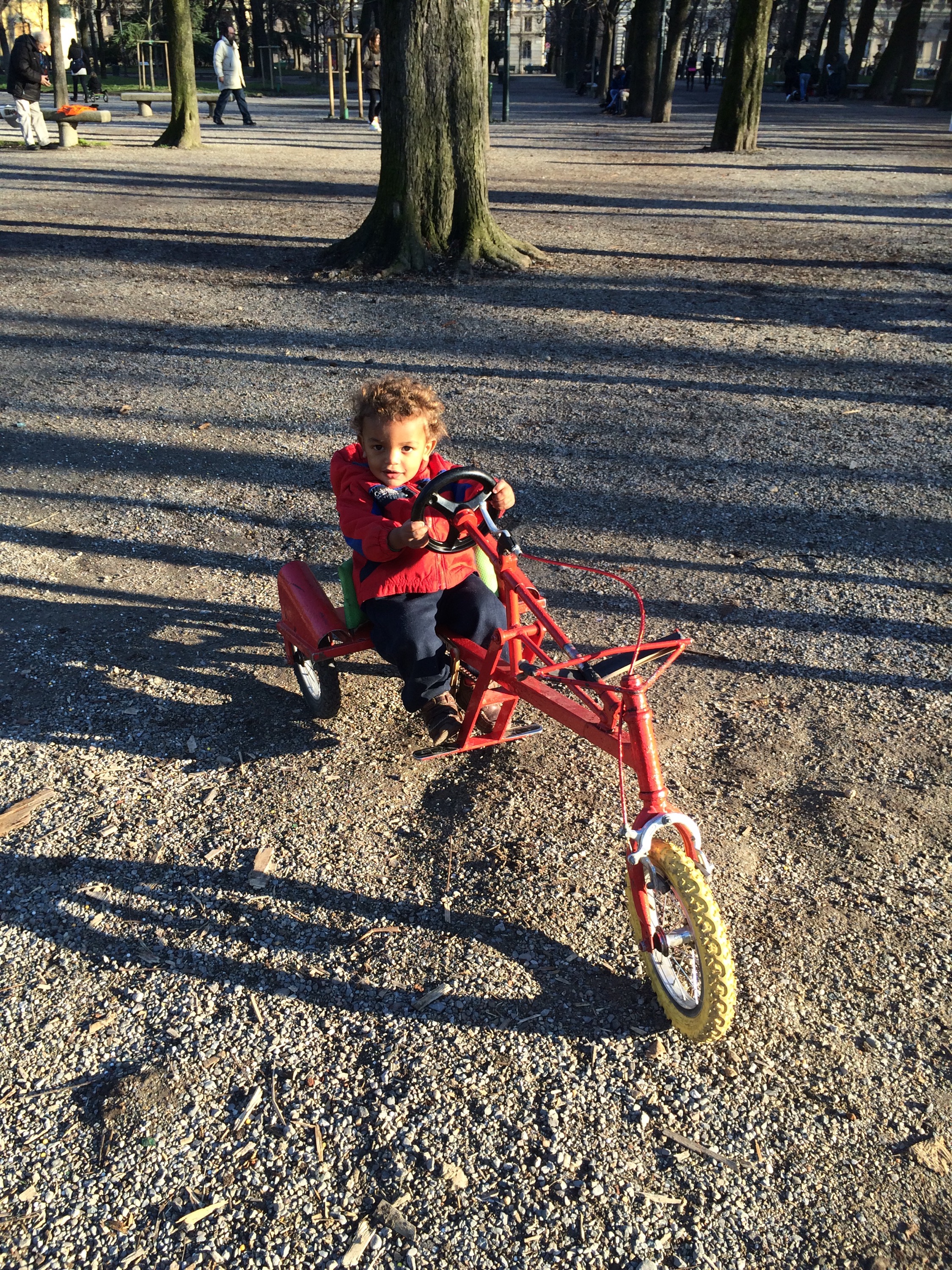 After days of travelling and being shunted around the kids were in desperate need of a proper play in a playground. We’ve moved to the Milan Ritz to be with the BGTW AGM crowd and they will spend the whole day tomorrow in the hotel room while I attend the meeting, so we were very glad it was walking distance to the Giardini pubblici Indro Montanelli, where there was not just one but two well-equipped playgrounds, as well as BMXers doing tricks and fantastic kids bikes to hire that have a push pedal. The bikes cost €5 for 20 mins and I hired one for my 33-month-old daughter and the man let my 18-month-old son have one free – presumably because he would struggle to make go. However he surprised us and was soon zooming round the park. The guy is there every week day from 3.30pm to 5.30pm if it’s not raining and all day at weekends.